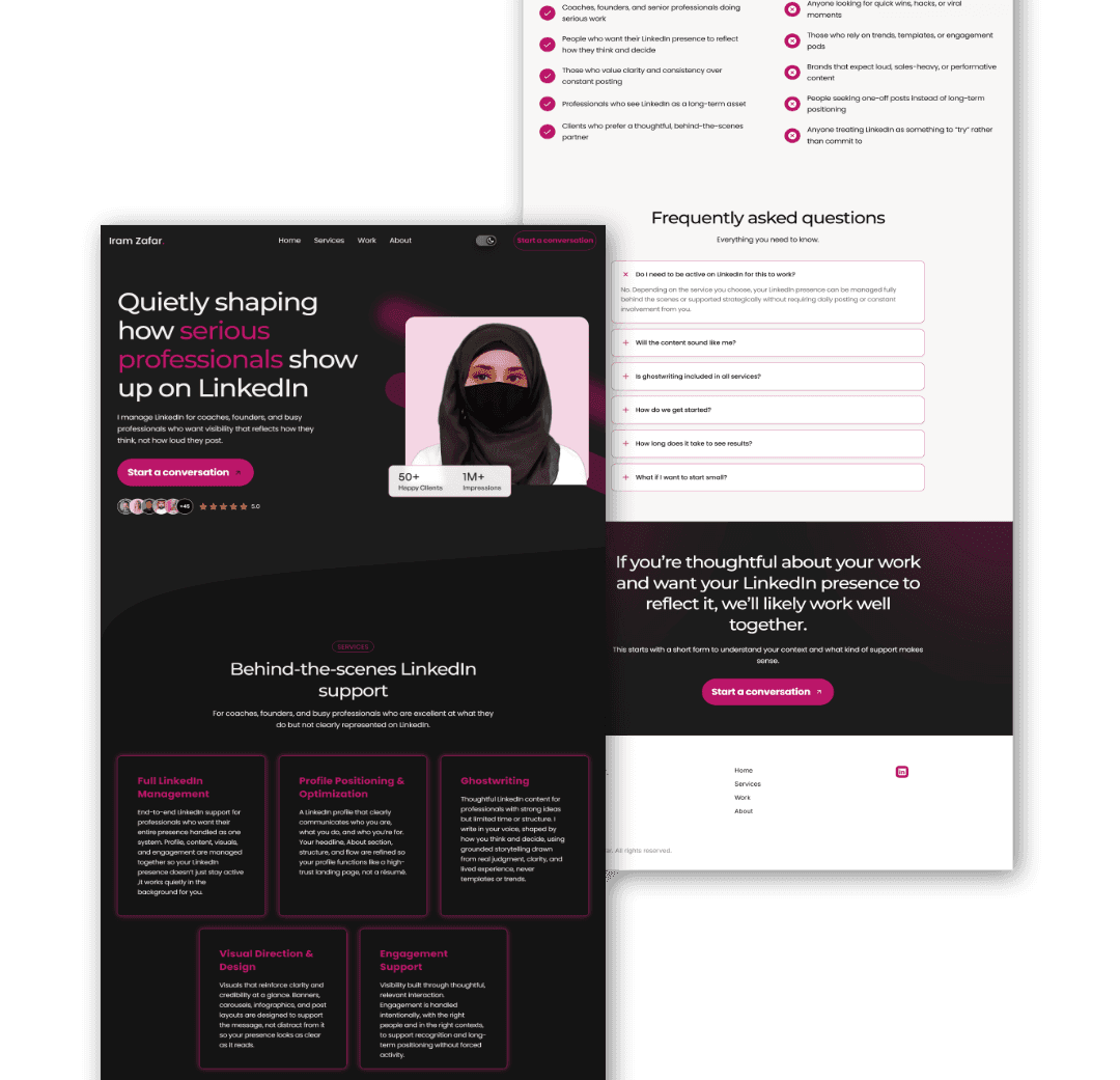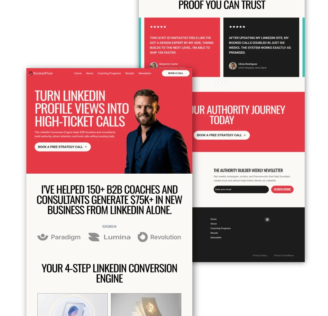 A conversion-focused website built to help a LinkedIn coach turn profile views into booked calls. The goal was simple: clarity, credibility, and conversion without overwhelming visitors.