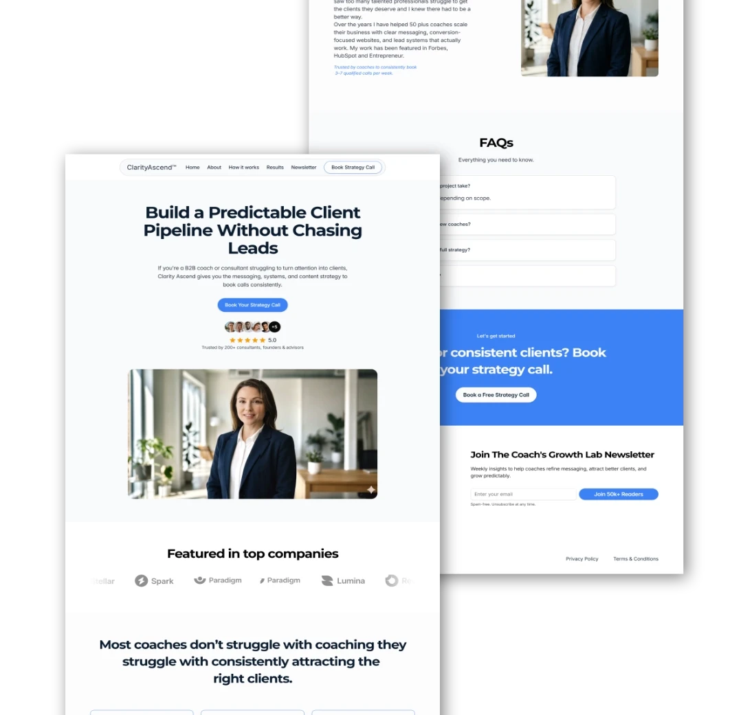 Clarity Ascend is a conversion-focused website built for B2B coaches who want to turn attention into consistent client bookings. The goal was to design a clean, modern experience that communicates authority, builds trust instantly, and guides visitors toward a clear next step.